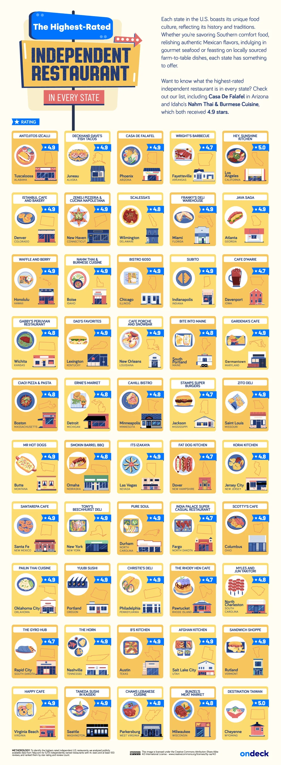 We all know about big restaurant chains in our cities. They often don’t come even close to offering the best food quality. This infographic from OnDeck covers the highest rated independent restaurants in every state: