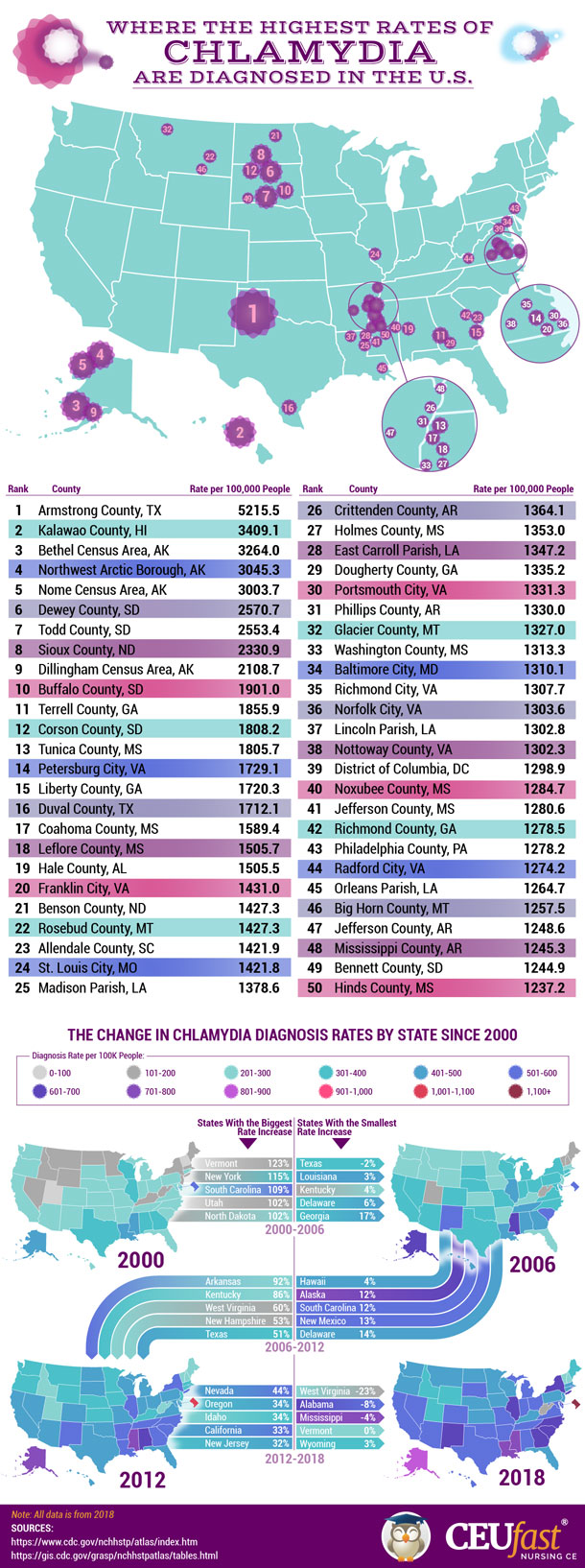 Chlamydia is a pretty common sexually transmitted infection caused by a bacteria that can be easily treated but could spread to other parts of your body ignored. This infographic from CEUfast takes a look at where in the U.S. the highest rates of Chlamydia are diagnosed: