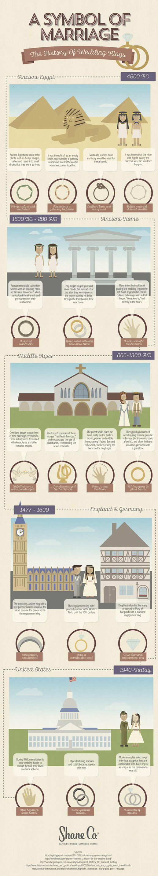 Those of you who have gotten married have had to spend some time shopping for a wedding ring. Have you ever wondered why couples even do this? This infographic form Shane Co visualizes the history of wedding rings:
