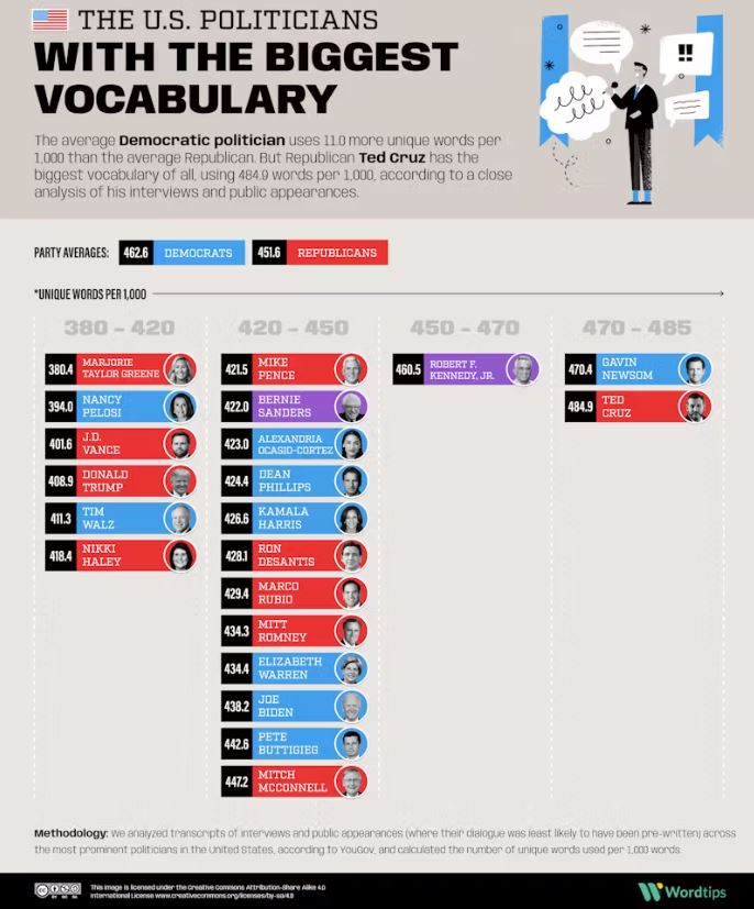 As we have learned in the past couple of elections in the US, you don’t need to have a large vocabulary to get elected president. Did you know that Ted Cruz and Gavin Newsom have the highest number of unique words per 1000 with Trump, Pelosi, and MTG among those with the lowest? This infographic from Word.Tips visualizes just this: