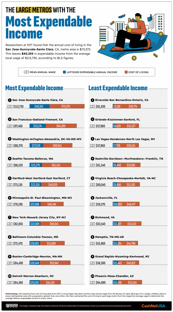 It is no secret that with the cost of living rising, many families don’t have as much disposable income. That leads to reduced consumer spending, which affects local businesses. New businesses don’t tend to open in these areas either. This infographic from CashNetUSA takes a look at the large metros with the most expendable income: