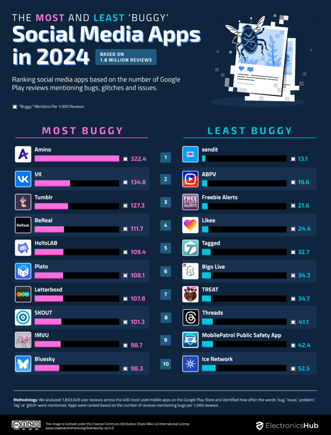 It is no secret that many of our favorite apps have certain annoying bugs, especially various social media apps. This infographic from ElectronicsHub covers the most and least buggy social media apps in 2024: