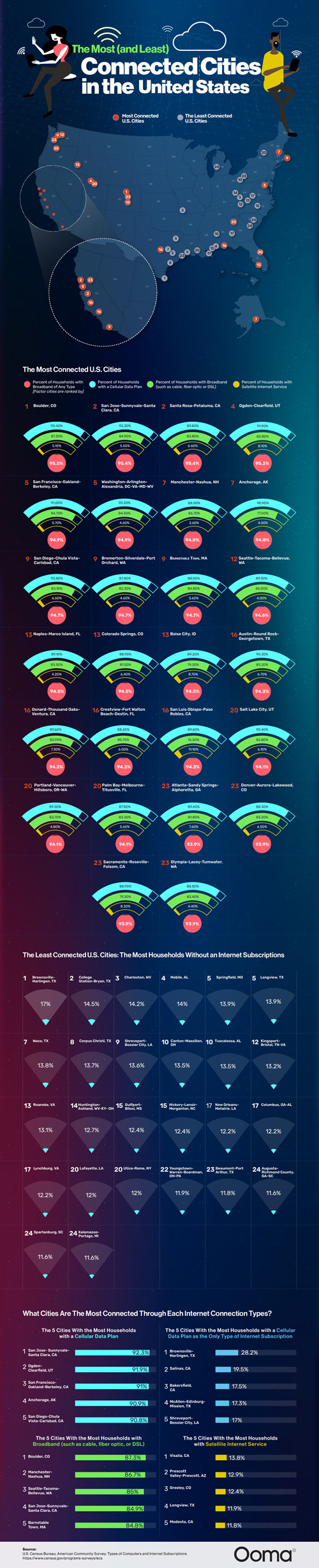 In this day and age, many of us assume that everyone has access to some form of high speed internet. Not every city in the US is connected though. This infographic from Ooma covers the most and least connected cities in the United States: