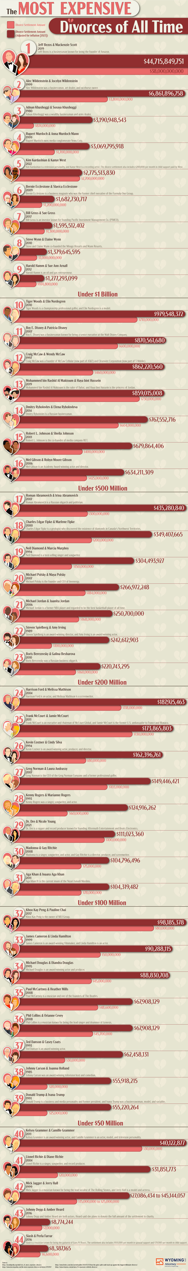 Everyone knows that divorces can be quite messy. That is especially the case when two high profile people try to get one. This infographic from Wyoming Attorney LLC takes a look at the most expensive divorces of all time: