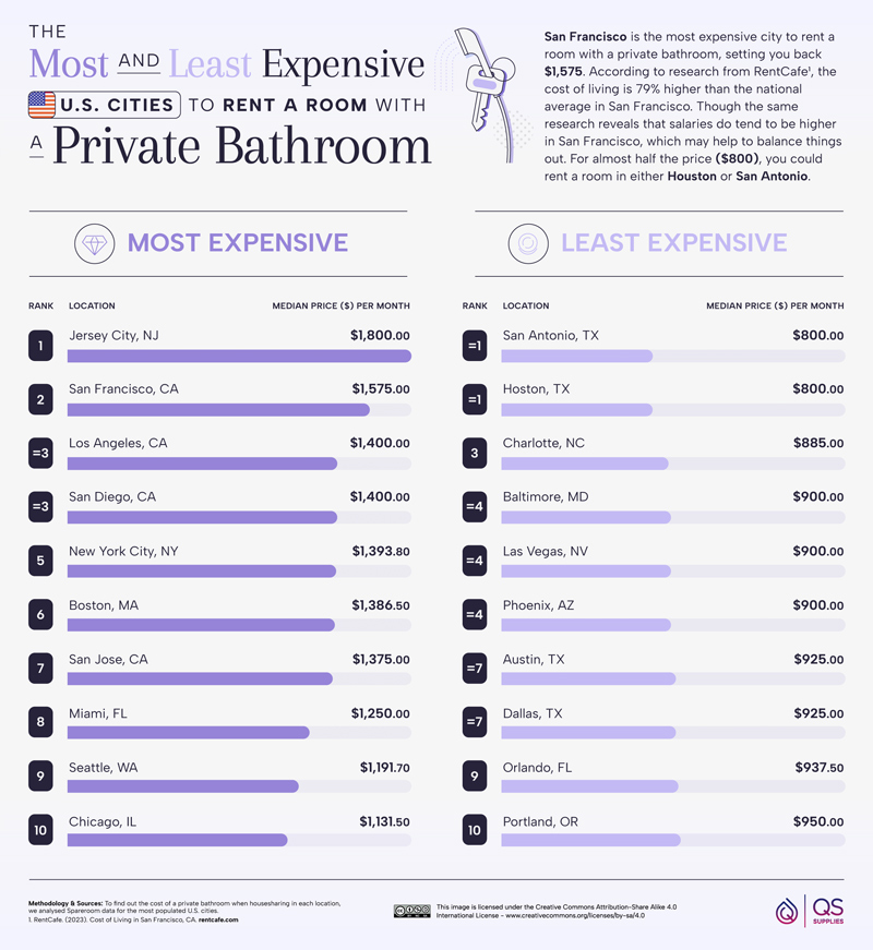 Having to share a bathroom after renting a room is not ideal. If you want to have your own bathroom, you should be ready to pay more. This infographic from QS Supplies covers the most and least expensive US cities that you can rent a room with a private bathroom: