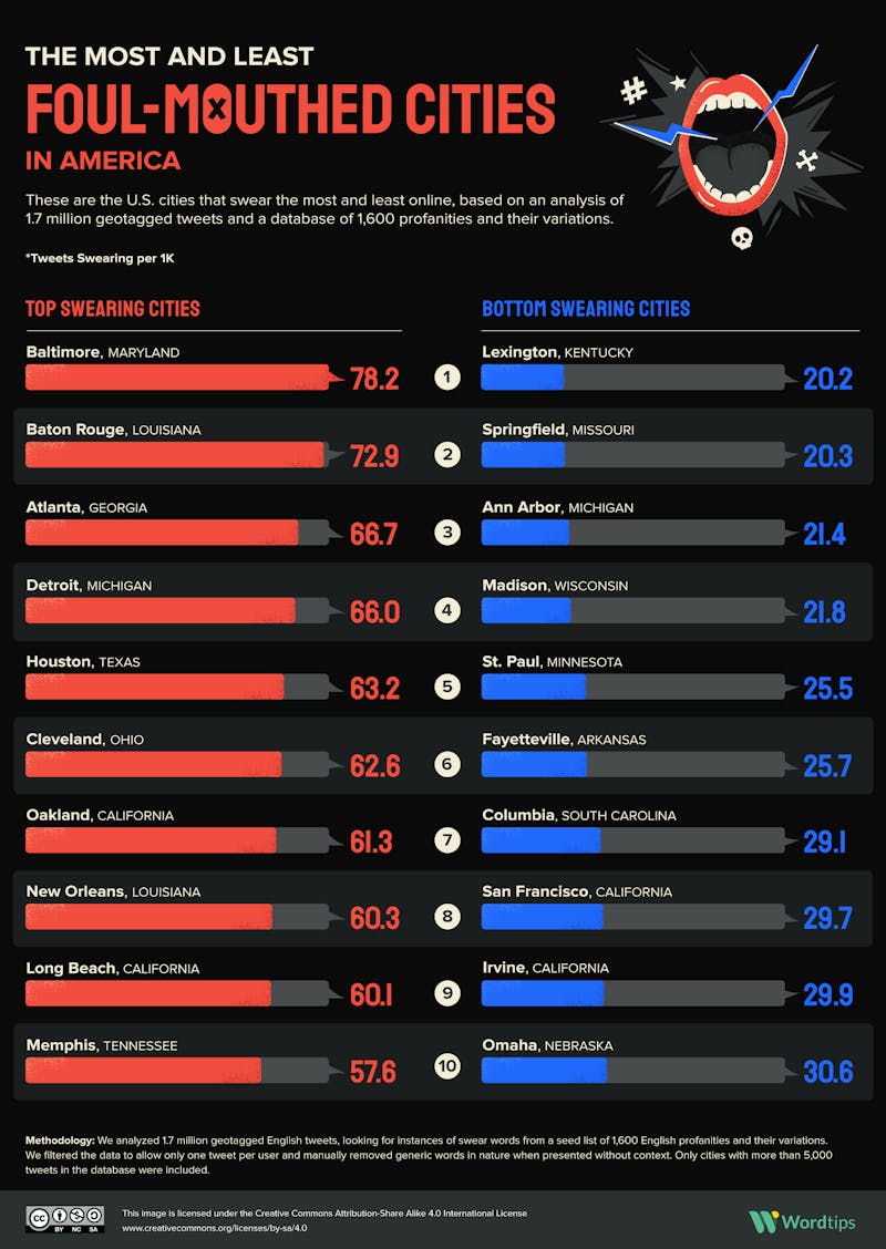 We have all seen people who swear like drunken sailors from time to time. It doesn’t happen in every city though. This infographic from Word.Tips covers the most and least foul-mouthed cities: