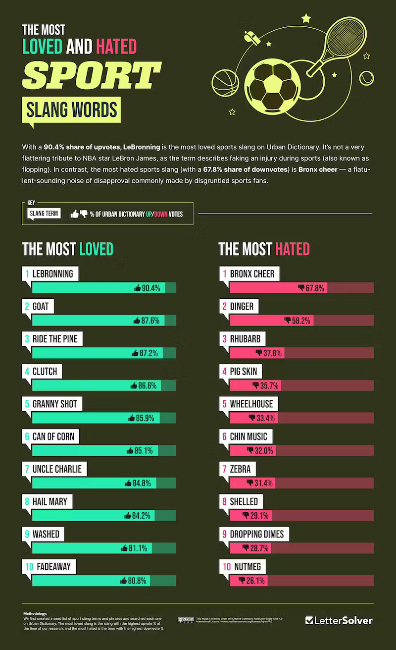 Those of you who are passionate about sports probably keep up with the latest slangs such as Lebronning and can of corn. LetterSolver has put together an infographic that visualizes the most loved and hated sport slang words: