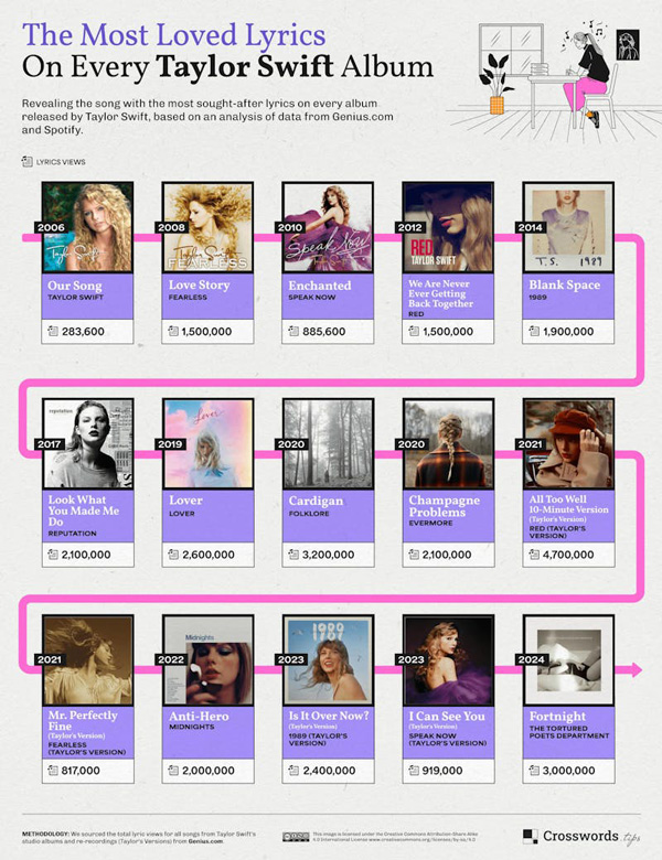 Taylor Swift has millions of fans around the world and plenty of popular albums over the years. Have you ever wondered which one of her songs are the most popular per album? This infographic from Crosswords.tips takes a look: