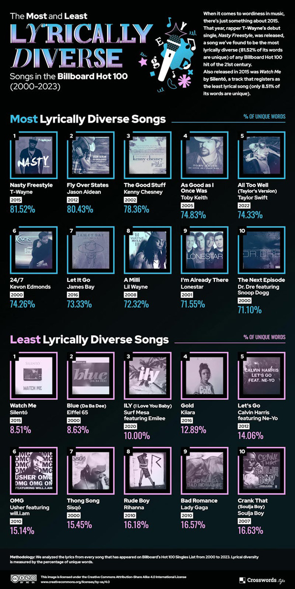 A lot of people that music is changing for the worse as it is getting simpler in rhythm and somewhat repetitive but is it really? This infographic from Letter Solver explores whether billboard charts are getting more lyrically diverse: