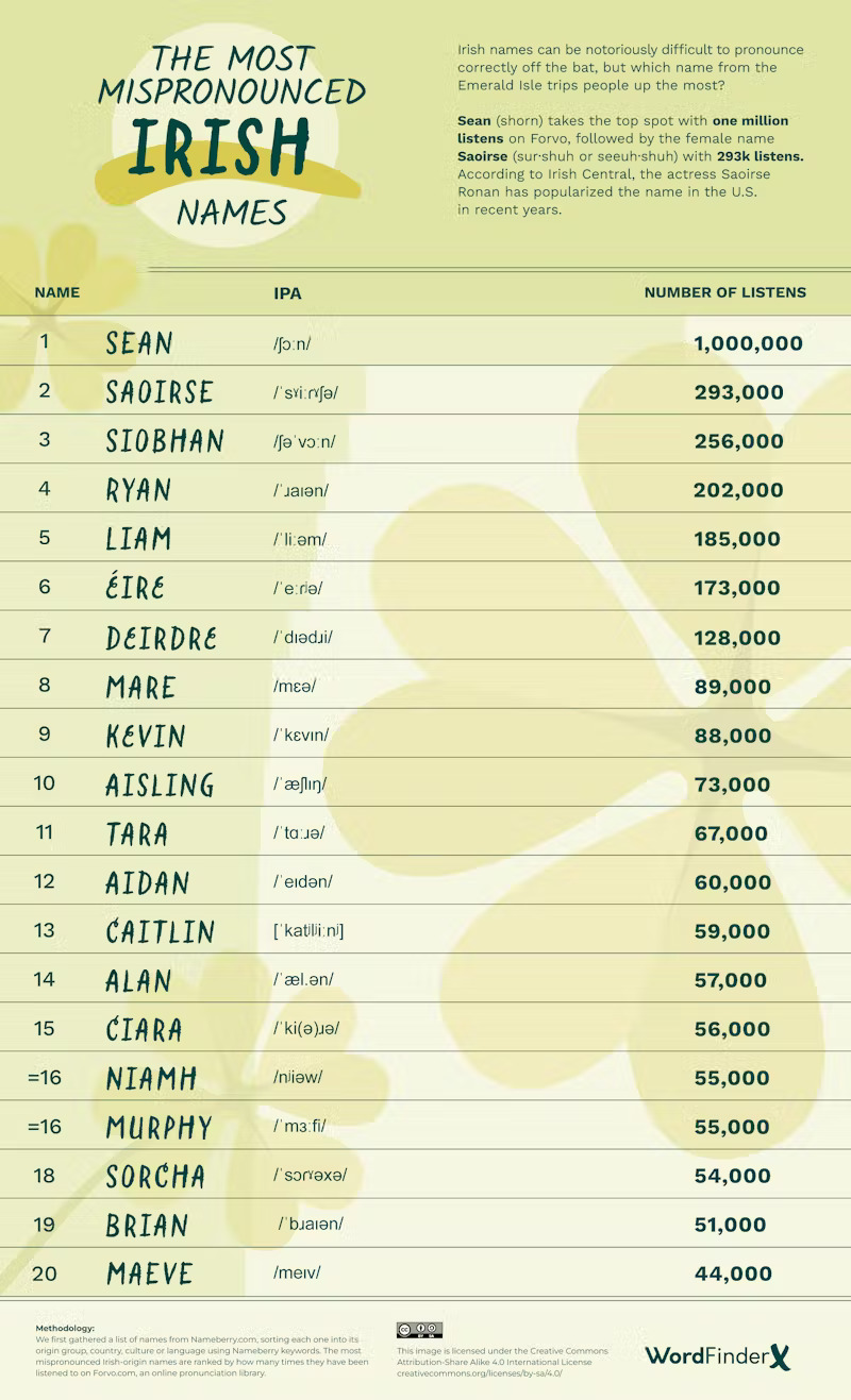 As you travel around the world, you are going to see names that are not easy to pronounce. For the longest time, I had problem pronouncing Saoirse. This infographic from Word FinderX covers a few other Irish names that are hard to pronounce: