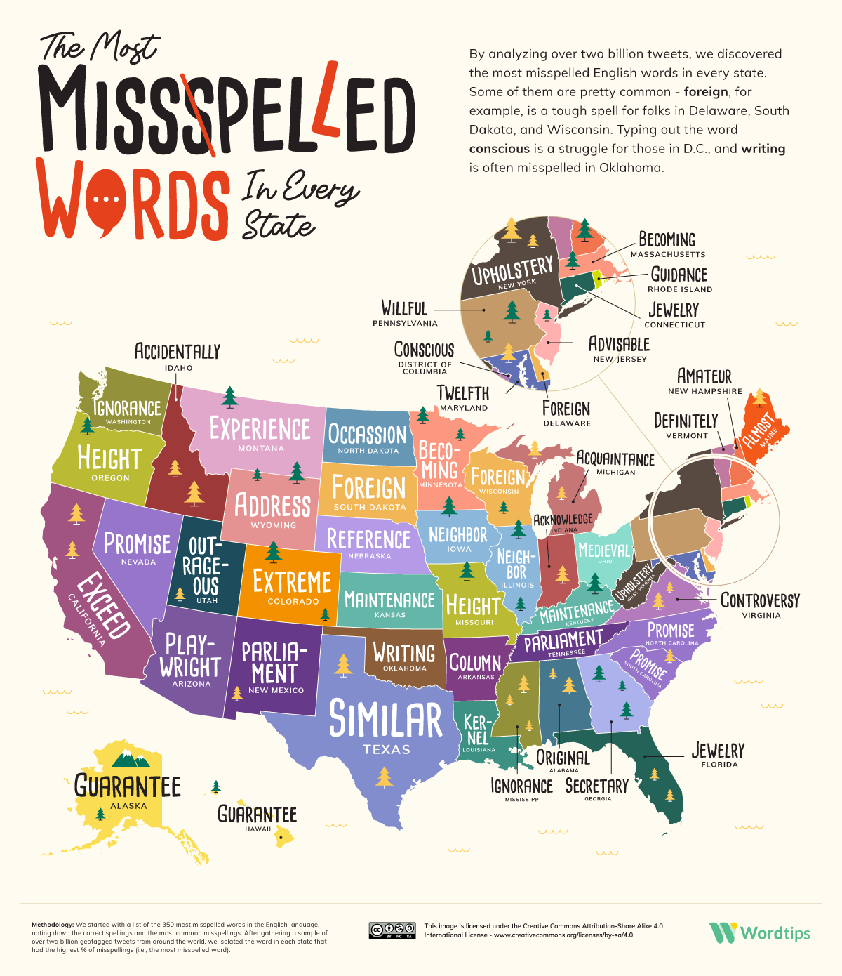 It is no secret that certain words tend to be misspelled by lots of people. Have you ever wondered which words people in your state have trouble spelling correctly? This infographic from Word Tips takes a look: