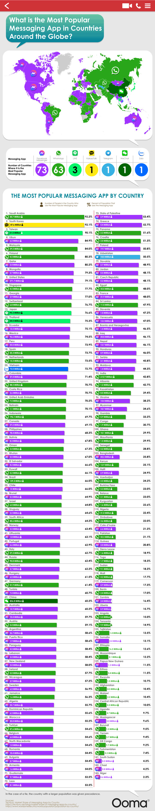 Messaging apps have become a big part of our lives. They are free to use and make it much easier to stay connected with others without a whole lot of hassle. Telegram, WeChat, and WhatApps are just some of the most popular messenger apps. This infographic from Ooma visualizes the most messaging apps around the globe: