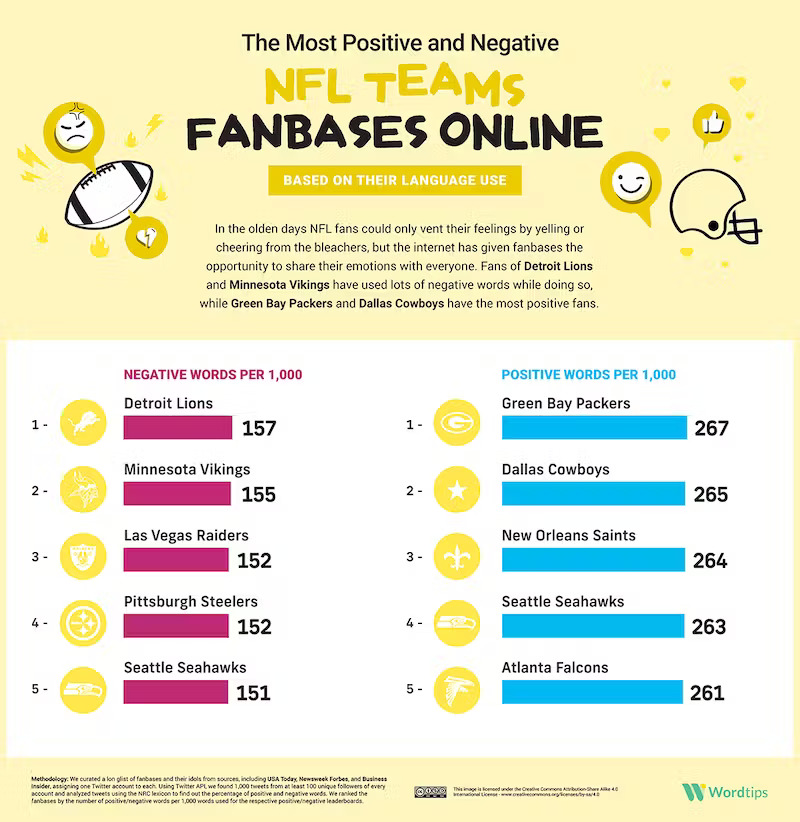 When it comes to sports, plenty of fans are pessimistic about their team if they are not winning enough. That applies to NFL teams too. This infographic from Word.Tips takes a look at the most positive and negative NFL fanbases online: