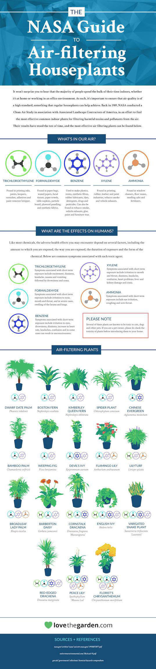 Growing your own plants indoors have many benefits for your health. They can reduce your stress and clean your air. This infographic from LovetheGarden.com serves as a guide to air-filtering houseplants:
