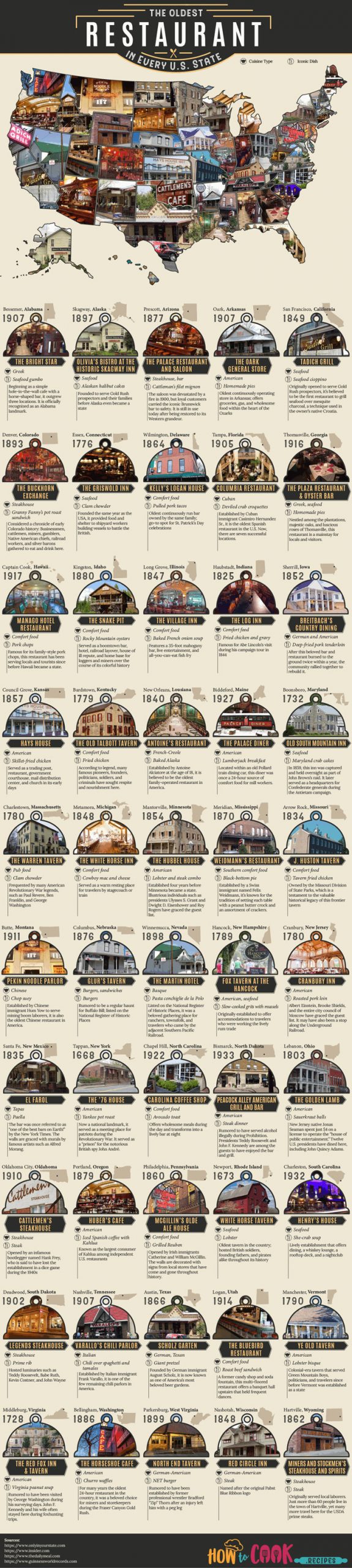 Every city has its own share of amazing restaurants and food places. Some of them have been around for decades. This infographic from HowToCook.Recipes takes a look the oldest restaurants in the United States: