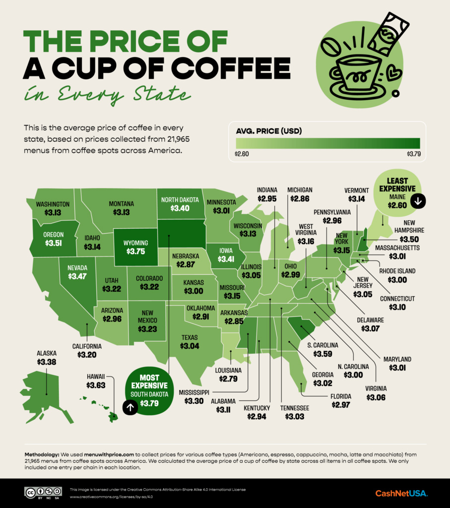 Many of us love drinking coffee everyday. It doesn’t cost the same in every state though. This infographic from CashNetUSA visualizes the price of coffee in every state:
