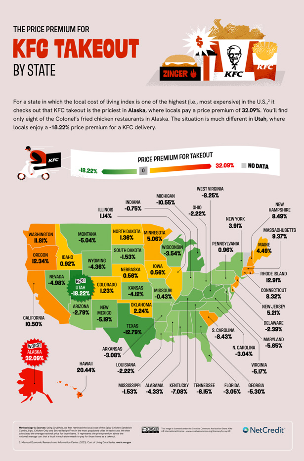 A lot of us order takeout at our favorite restaurants and fast chain food places regularly. The prices can quite differ from state to state. This infographic from NetCredit takes a look at the price premium for KFC takeout by state: