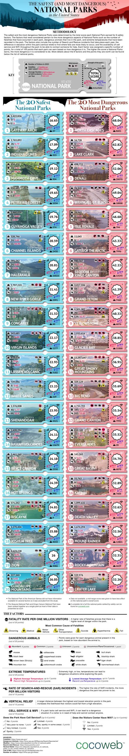 Visiting a national park can be fun but you need to do your homework to stay out of trouble. Drowning, medical emergencies, and falls claim lives at these places. This infographic from Cocoweb covers the safest and most dangerous national parks in the United States: