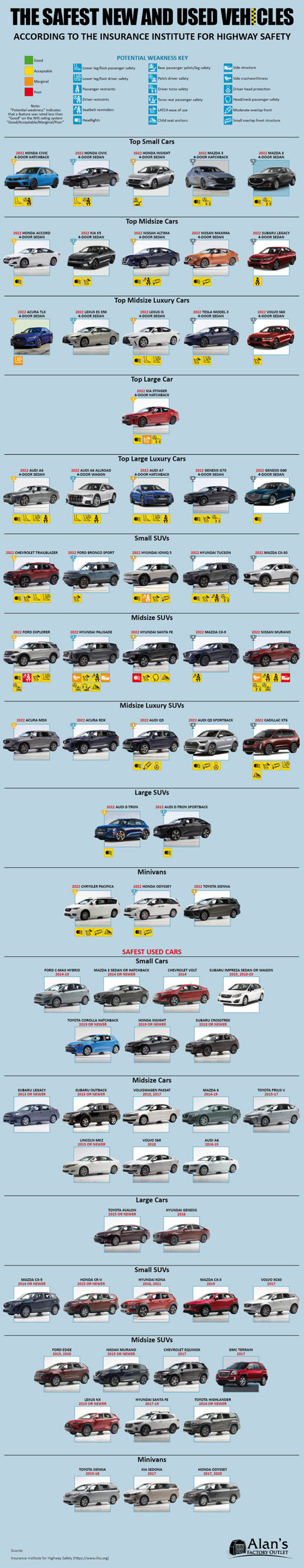 Buying a new car can be quite exciting but you need to do your homework to get a car thast has a good safety record. This infographic from Alan’s Factory Outlet takes a look at the safest new and used vehicles: