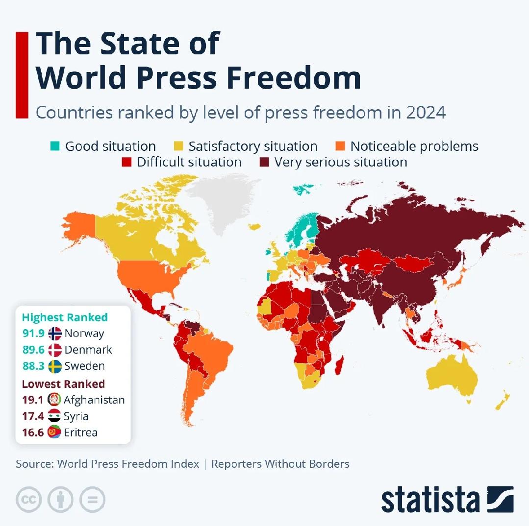 Freedom of press is something a lot of people want to have where they live. Unfortunately, many governments are not open to it. This infographic from Statista covers the state of world press freedom this year: