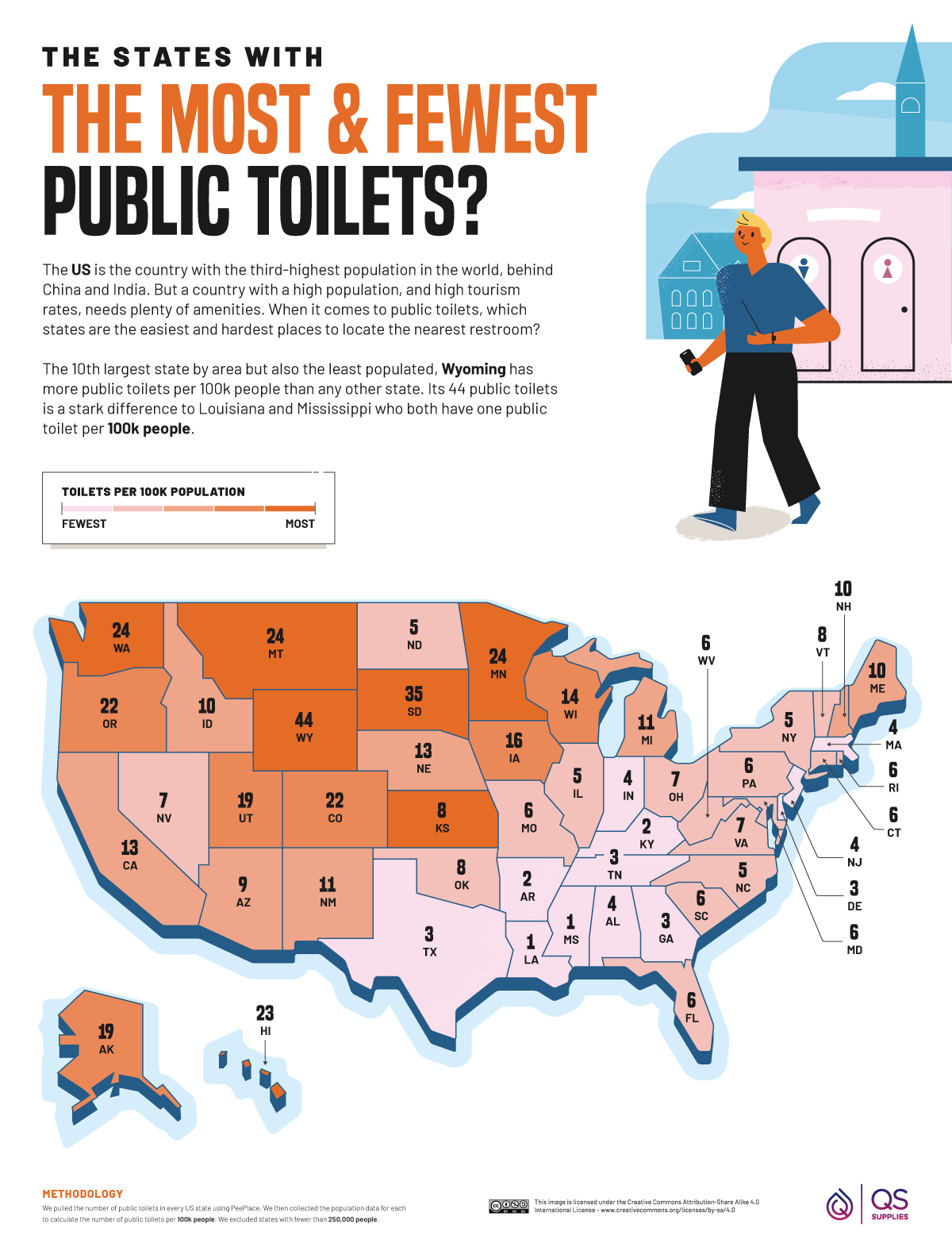 The US has a high rate of tourism but not all states and cities have enough public toilets to accommodate their people. This infographic from QS Supplies covers the US states with the most and fewest public toilets: