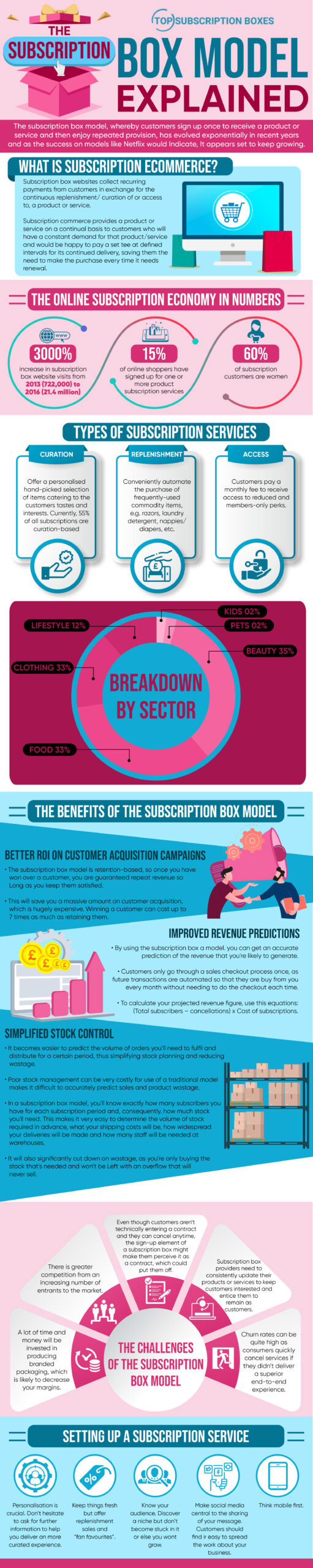 Subscription box businesses aim to make shopping automatic for customers. They enable shoppers to sign up to receive a product on a continual basis. Customers can pay to get a curated selection of items, products they’ve run out of, or member-only perks. This infographic from Top Subscription Boxes explains how this business model works: