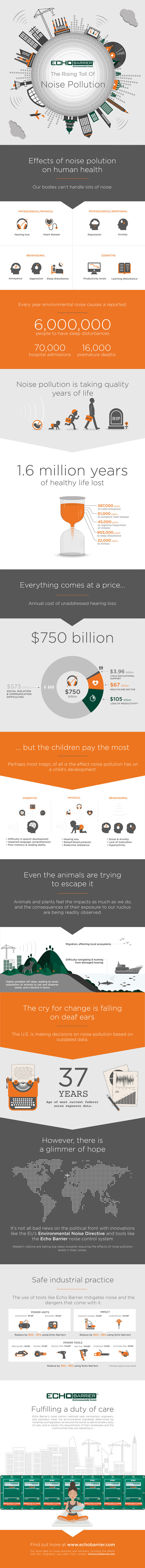 We have all heard about noise pollution all around us. Did you know that our body was not made to handle lots of noise all the time. This infographic from EchoBarrier takes a look at the rising toll of noise pollution:
