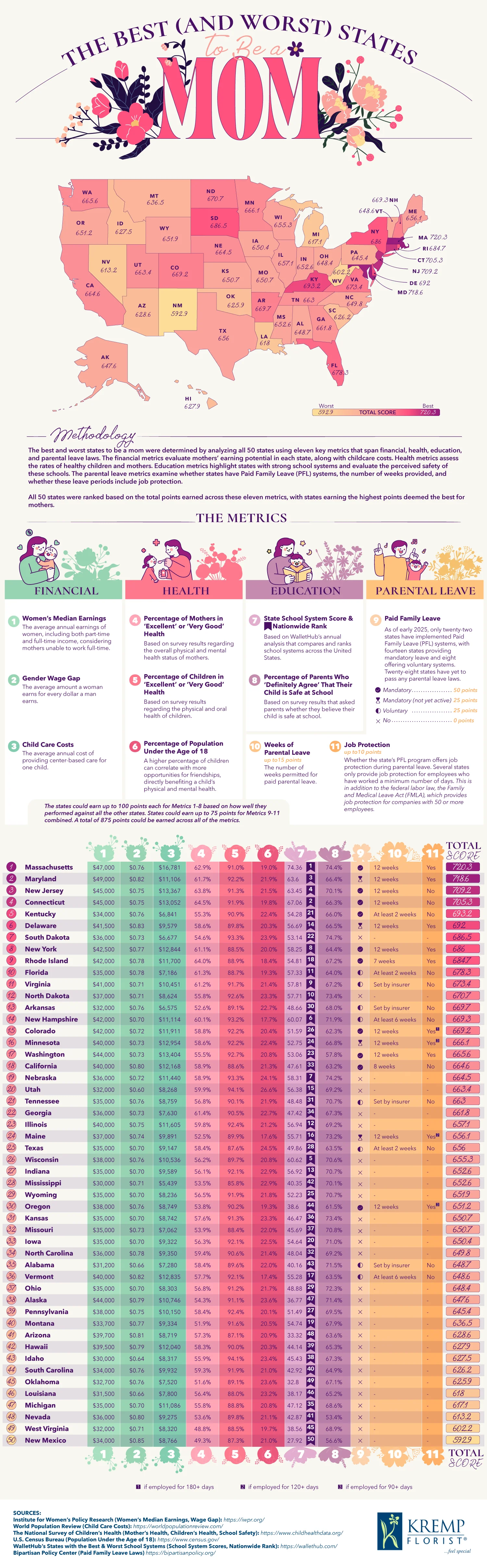 Becoming a mom can be quite exciting and stressful at the same time. The last thing you want to worry about is not having the right environment for your small family to grow. Kremp Florist covers the best and worst states to be a mom: