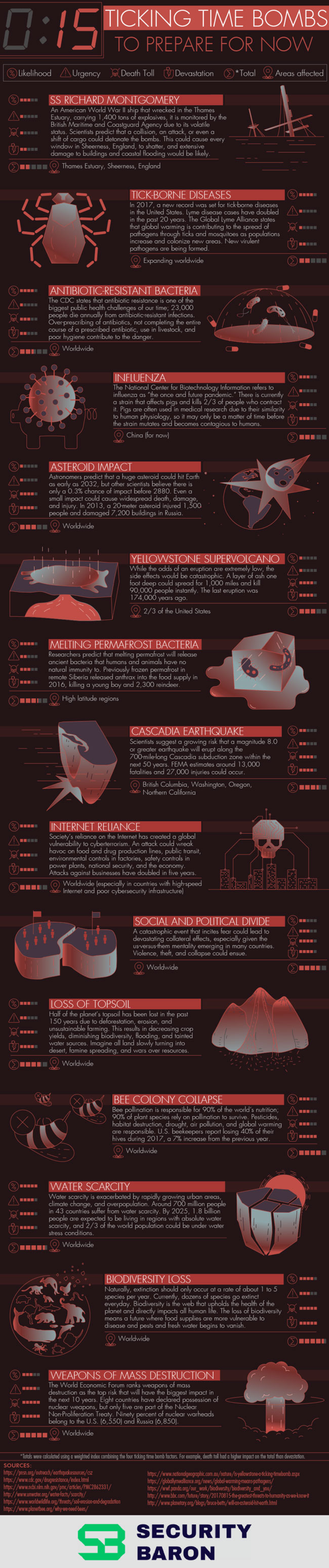 We hear about antibiotic-resistant bacteria, potential asteroids hitting earth, water scarcity and civil wars all the time. One or more of those scenarios could turn in reality in the future. This infographic from Security Baron takes a look at 15 ticking time bombs you should be prepared for: