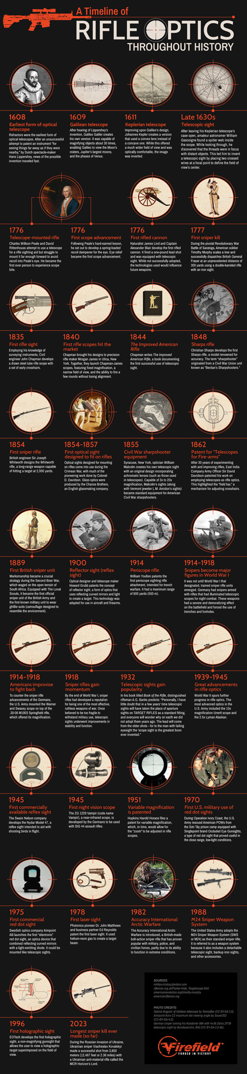 There are plenty of fancy riflescopes available these days. They allow for shots from up to 3800 meters away. The first optical telescope was made in 1608. This infographic from Firefield visualizes a timeline of rifle optics throughout history: