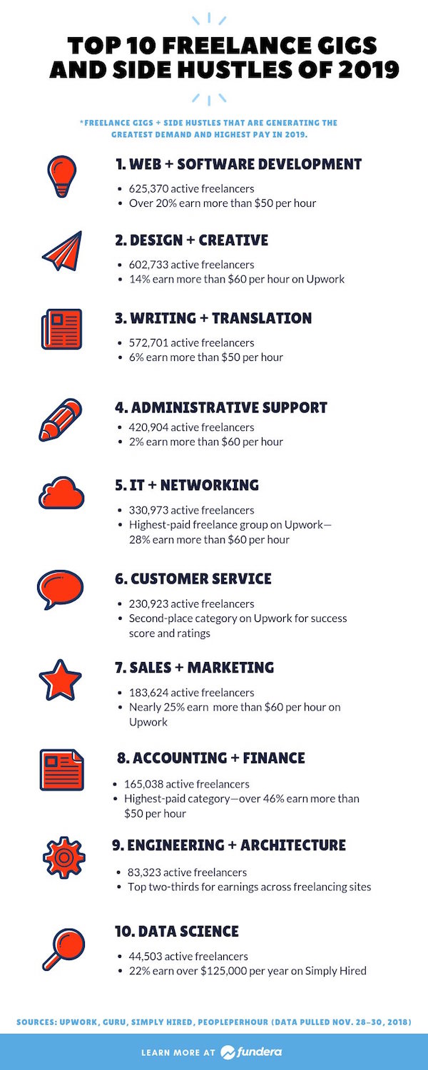 Lots of people have side hustles these days. They allow you to earn some extra cash without completely giving up your life. Fundera has put together a list of freelance gigs and side hustles you can try in 2019: