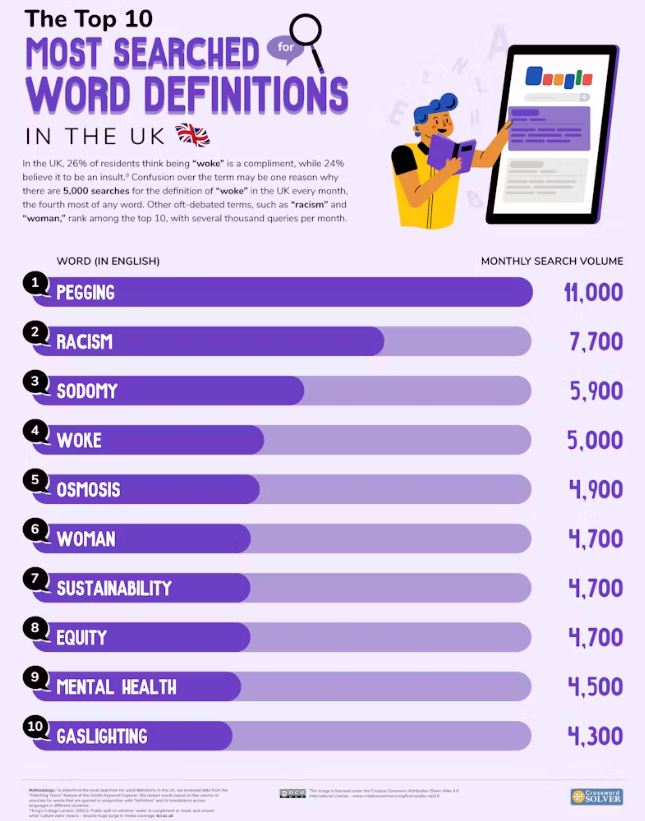 We hear about woke, equity, mental health and other words all the time. Naturally, a lot of people look up the definition of these words. This infographic from Crossword Solver covers the top 10 most searched for word definitions in the UK: