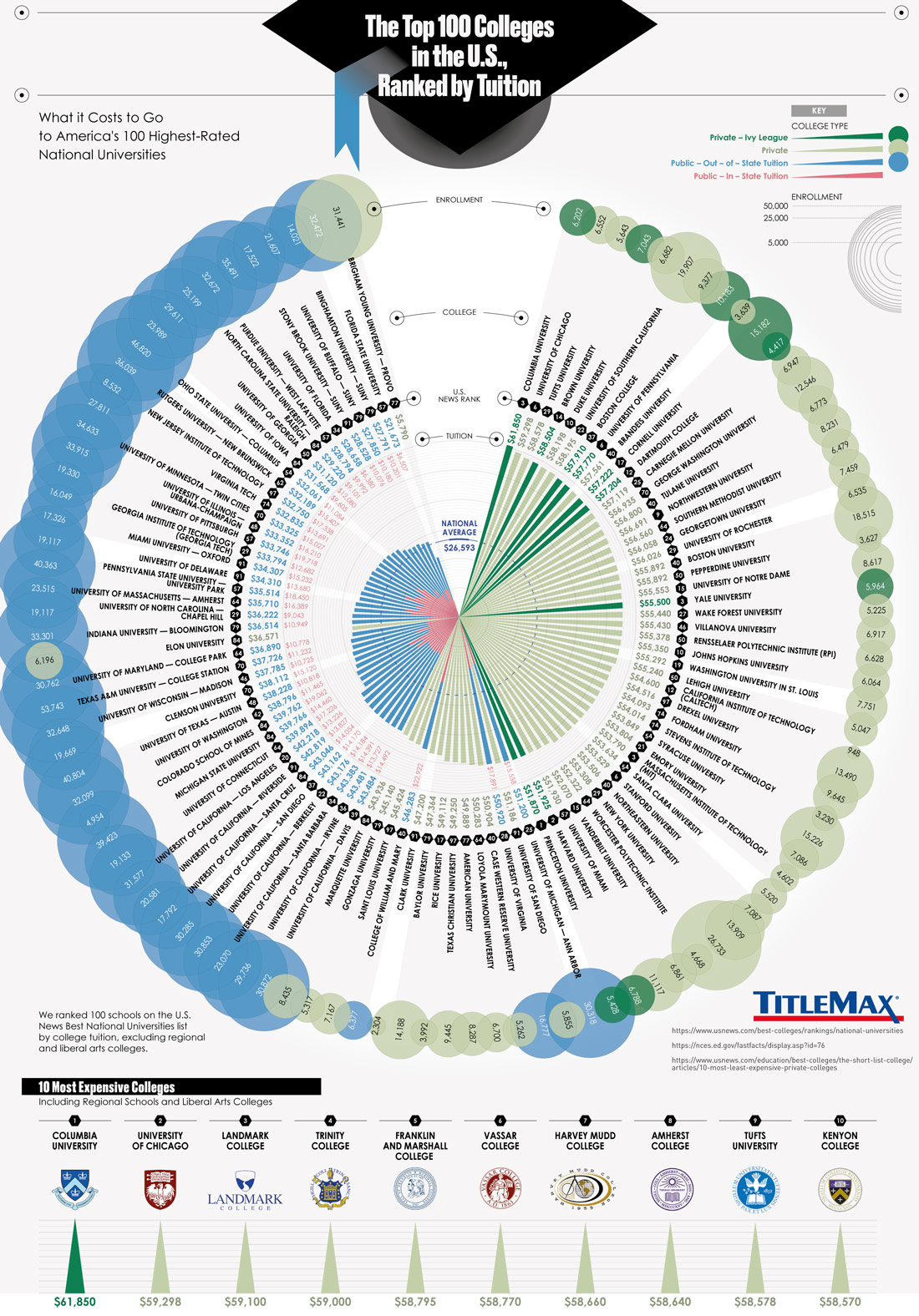 It is no secret that going to college can be quite expensive in the U.S. The Columbia University, University of Chicago, and Trinity College are among the most expensive colleges. This infographic from TitleMax visualizes top 100 U.S. universities based on tuition: