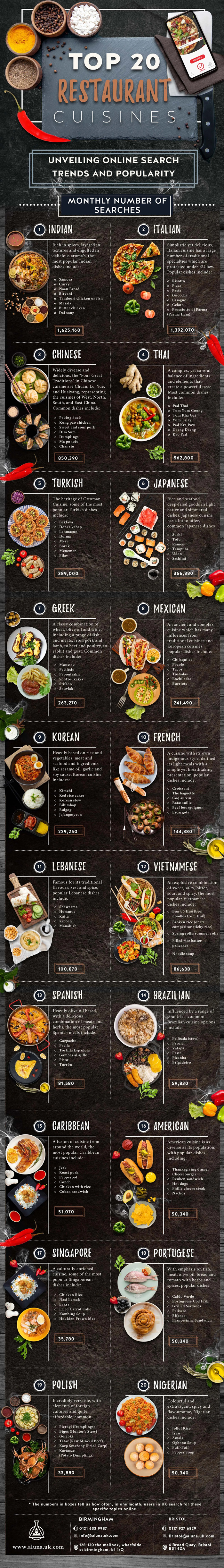 Many of us enjoy eating out from time to time. Trying the same cuisine every time can get a bit boring. Have you ever wondered which are the most popular cuisines around the world? Not surprisingly, Indian, Italian, and Chinese dishes top the list. This infographic from Aluna takes a closer look:
