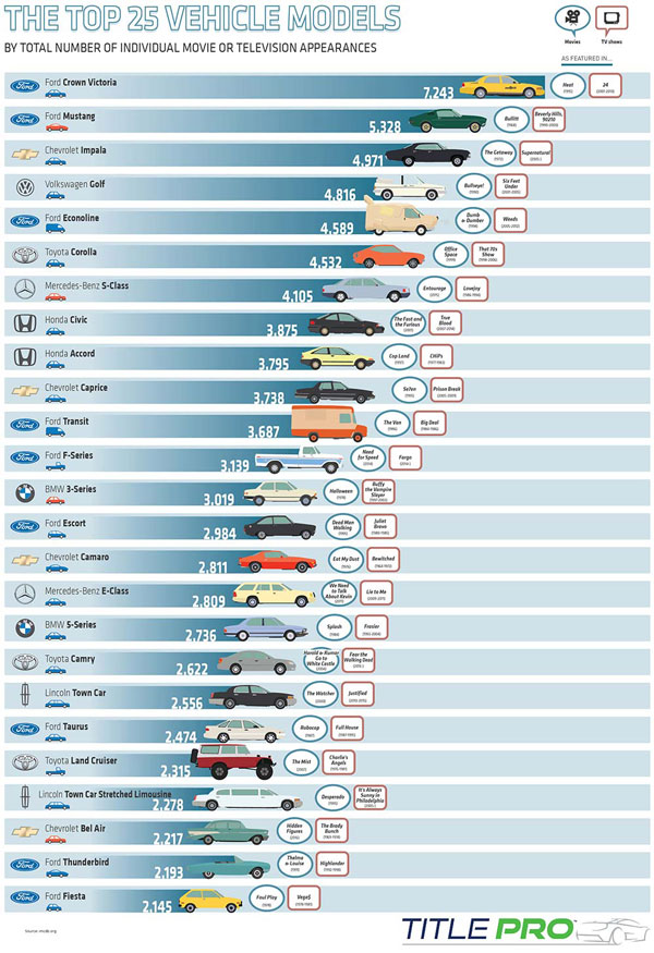 It is no secret that certain cars and models show up more often in the movies than others. This infographic from Title Pro shows which cars are seen most often in movies and TV shoes: