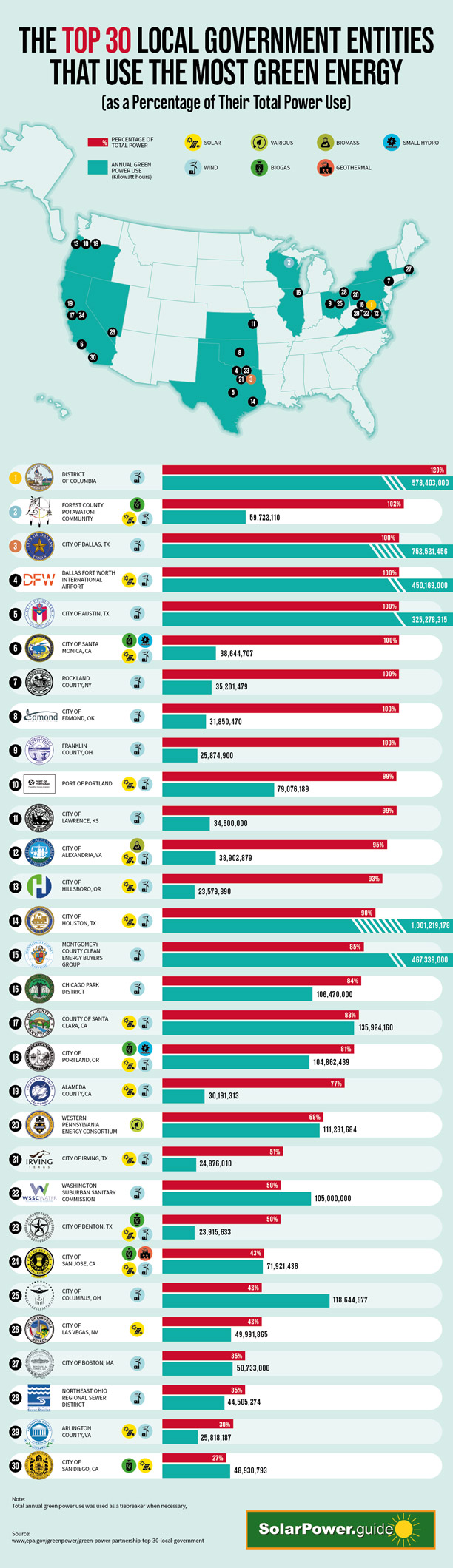 Plenty of companies are investing in green technologies. Even many government entities are relying on solar, wind, and other renewable energies these days. This infographic from SolarPower.Guide takes a look at 30 local government entities with most green energy: