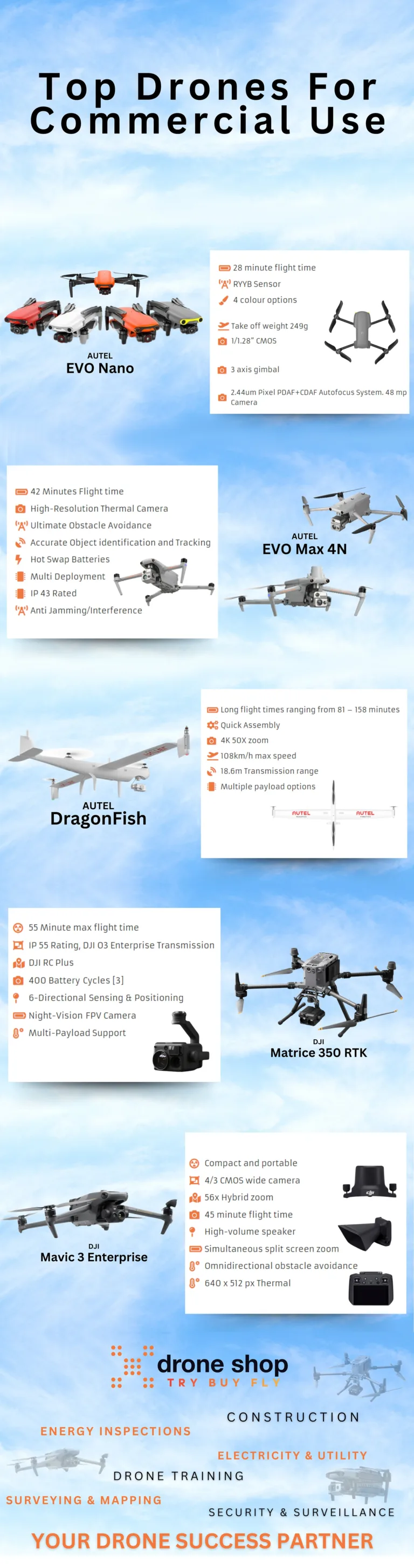 There are lots of affordable drones on the market but many of them are not designed for commercial applications. Consumer drones may not have the battery life and sensors needed to handle complex missions. Businesses need to do their homework on take off weight, cameras, object tracking and various other features to make the right choice. This infographic from Drone Shop covers top drones made for commercial use: