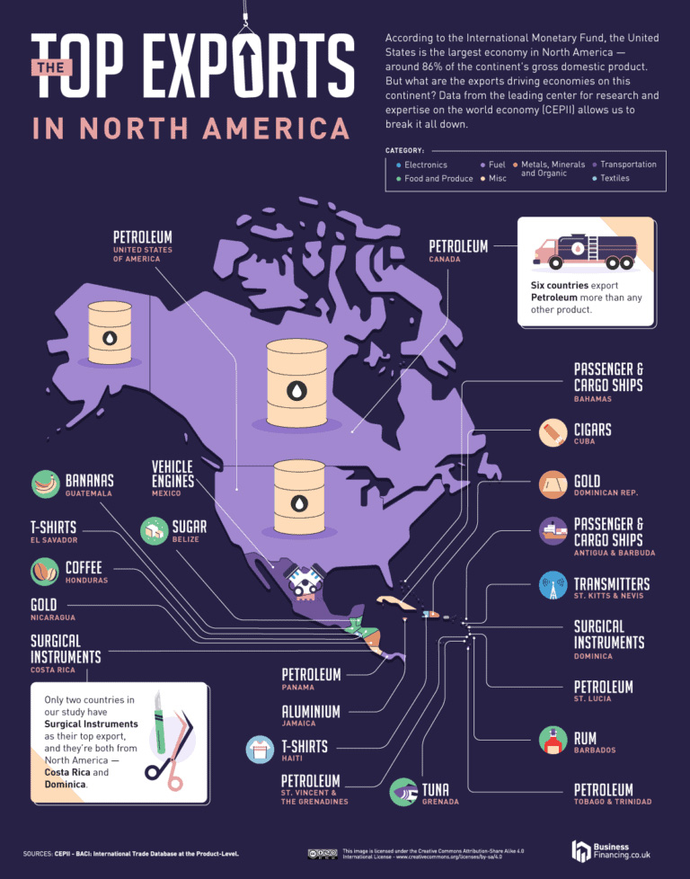 The United States is the largest economy in North America with 85+% of the continent’s gross domestic production. Have you ever wondered what are the top exports for this region? This infographic from Business Financing visualizes that: