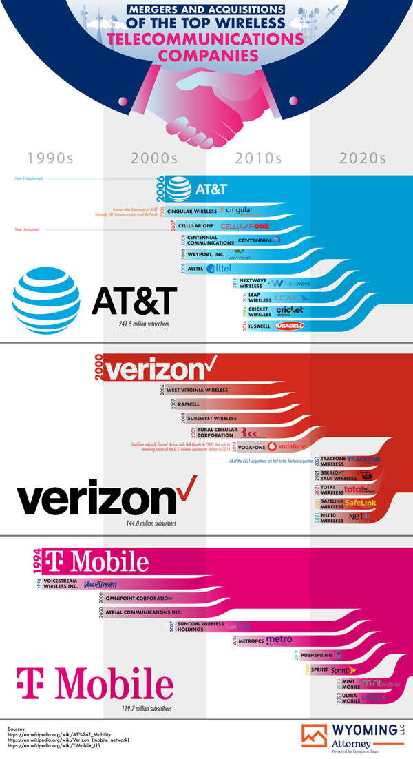 A lot of companies have come and gone in the telecom industry. AT&T, Verizon, and T-Mobile have all acquired various companies over the years. This infographic from Wyoming Attorney LLC visualizes top mergers and acquisitions in this industry: