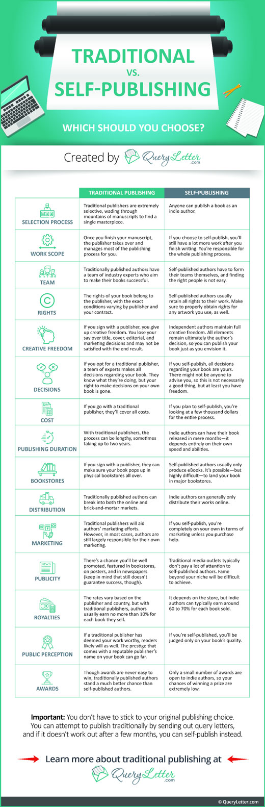 In this day and age, more people are publishing their own books. In fact, it is easier than ever to publish a book as an indie author. Wonder how it is different than traditional publishing? This infographic from QueryLetter can help: