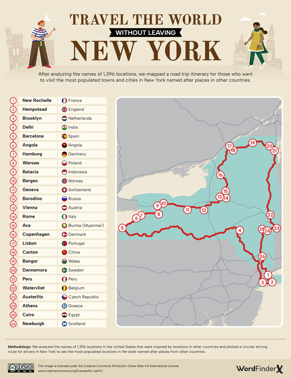 It is no secret that many towns in the US are named after places in other countries. You are likely to see many of them as you go around New York. This infographic from WordFinder covers many towns and cities that are named after other countries: