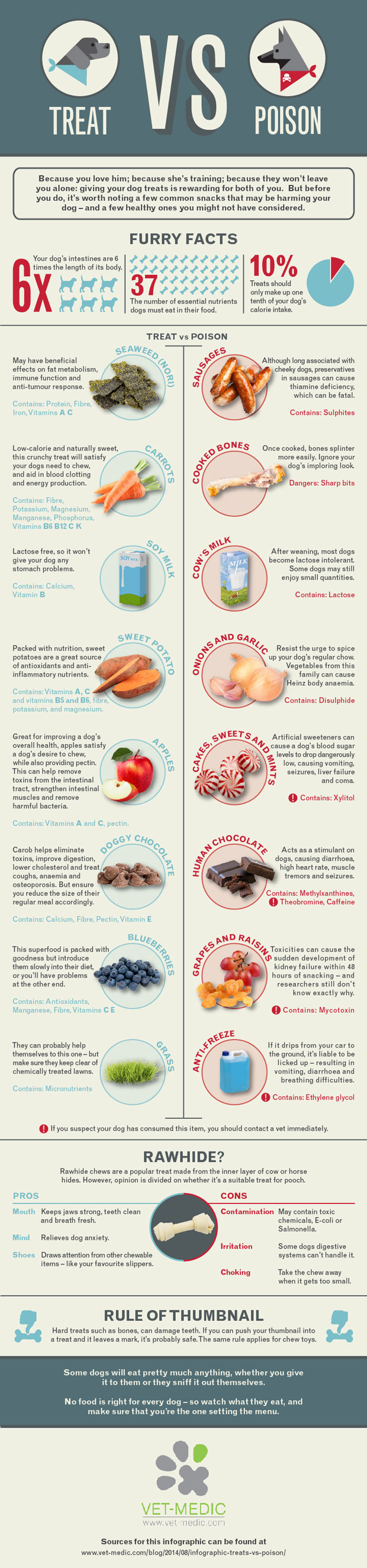 Adopting a new dog is lots of fun. You should be careful about what you feed your new pet though. This infographic Vet Medic helps you differentiate between treat and poison for your dog: