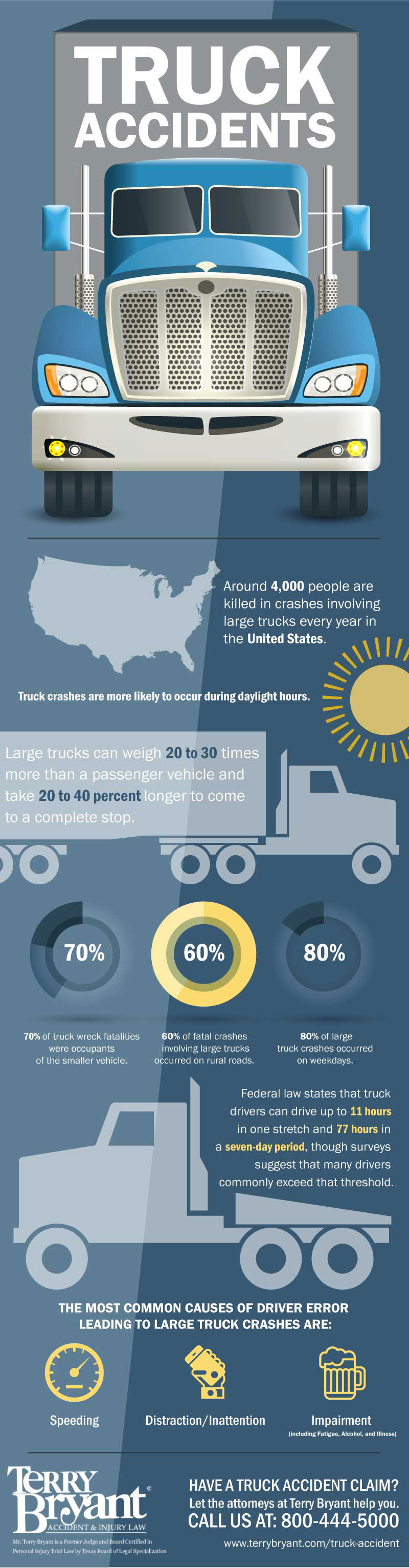 Truck accidents can happen due to a variety of reasons, including speeding, fatigued driving, and driver inexperience. Thousands of people are killed in these types of crashes every year in the United States. This infographic from Terry Bryant takes a look at a few sobering facts and stats on truck accidents:
