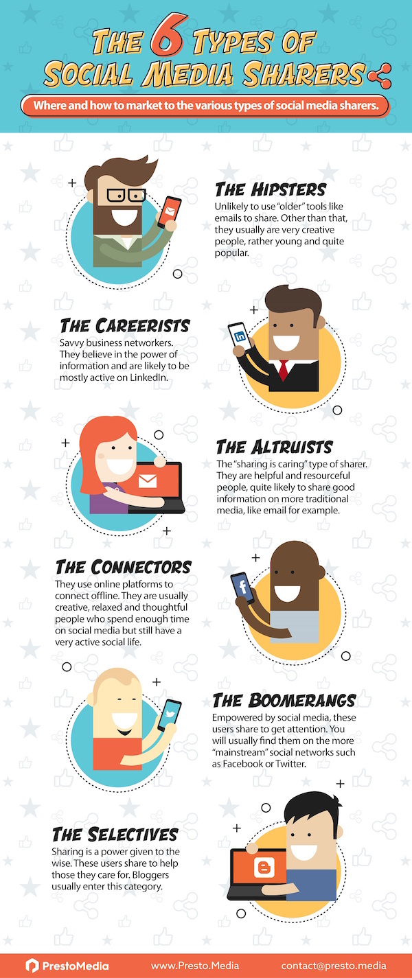 Many businesses understand the importance of reaching out to top influencers and content sharers. Not all social media sharers are the same. This infographic from Presto Media describes different types of content sharers:
