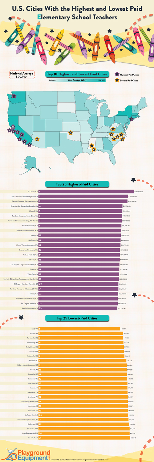 Pursuing a career as an elementary school teacher comes with its own challenges. A lot of teachers are underpaid for the amount of work they put in. This infographic from Playground Equipment covers the US cities with the highest and lowest paid elementary school teachers: