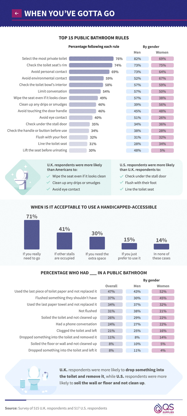 Those of you who use public restroom regularly know that they are not always clean. You wouldn’t want to make unnecessary contact with dirty surfaces. Finding the most private toilet would be convenient too. This infographic from QS Supplies covers a few unspoken bathroom rules you need to pay attention to: