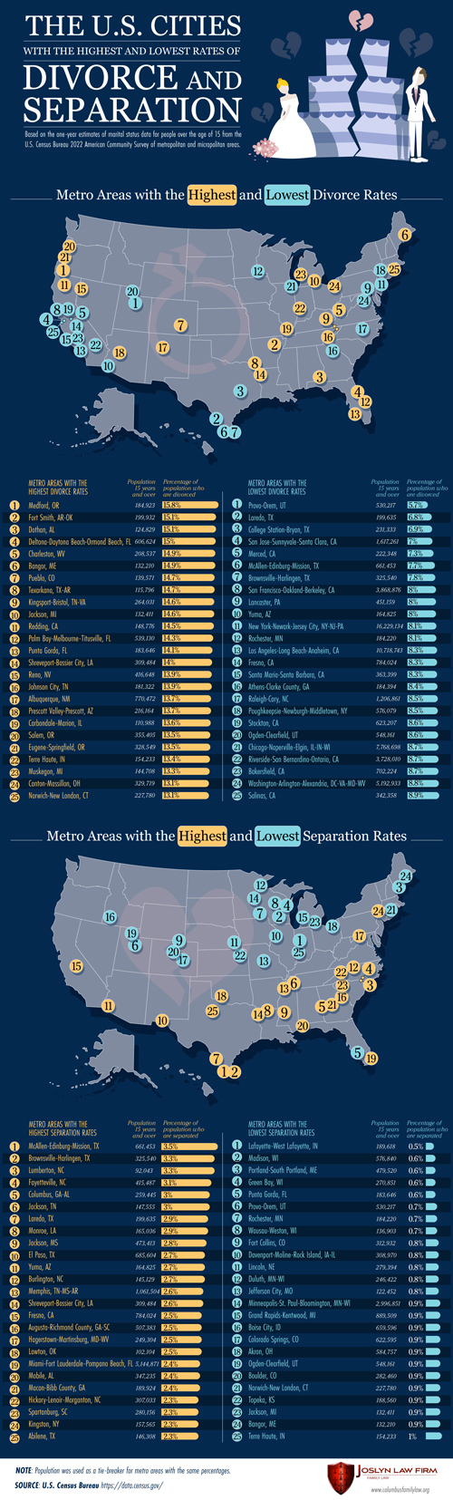 Nobody gets married expecting to get divorced in a few years. Unfortunately, separation and divorce happens to a lot of couples. This infographic from Joslyn Law Firm covers the US cities with the highest rate of divorce:
