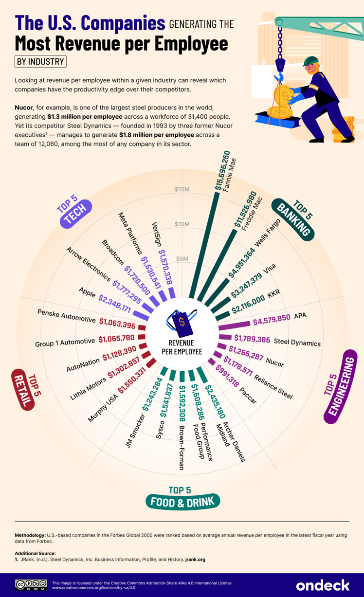 It is no secret that large corporations such as Apple, Meta, and Wells Fargo earn billions of dollars every year. They also have a lot of employees. Have you ever wondered which companies generate the most revenue per employee? This infographic from OnDeck takes a look: