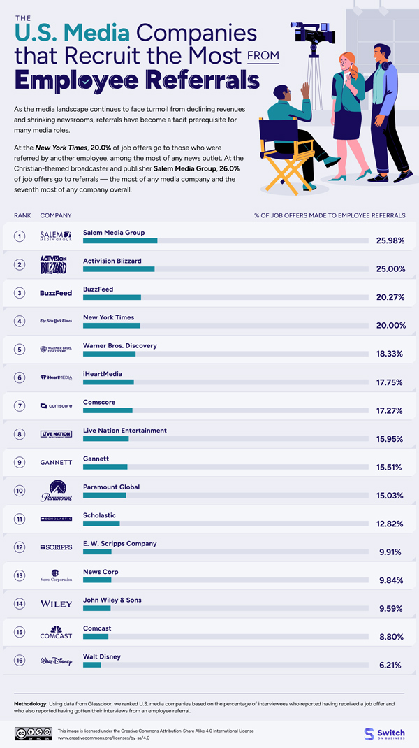 Who you know can improve your chances of getting a better job. Many US media companies now recruit people who are referred by current employees. This infographic from Switch on Business visualizes US media companies the most from employee referrals: