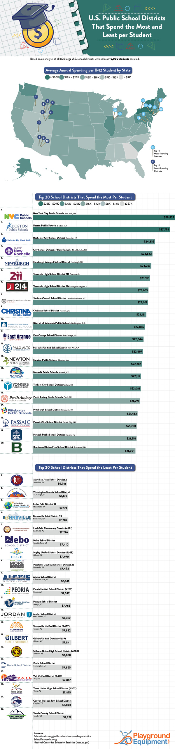 It is no secret that kids around the country don’t all get the same level of education. Public school districts don’t all spend the same amount of money per student as this infographic from Playground Equipment shows: